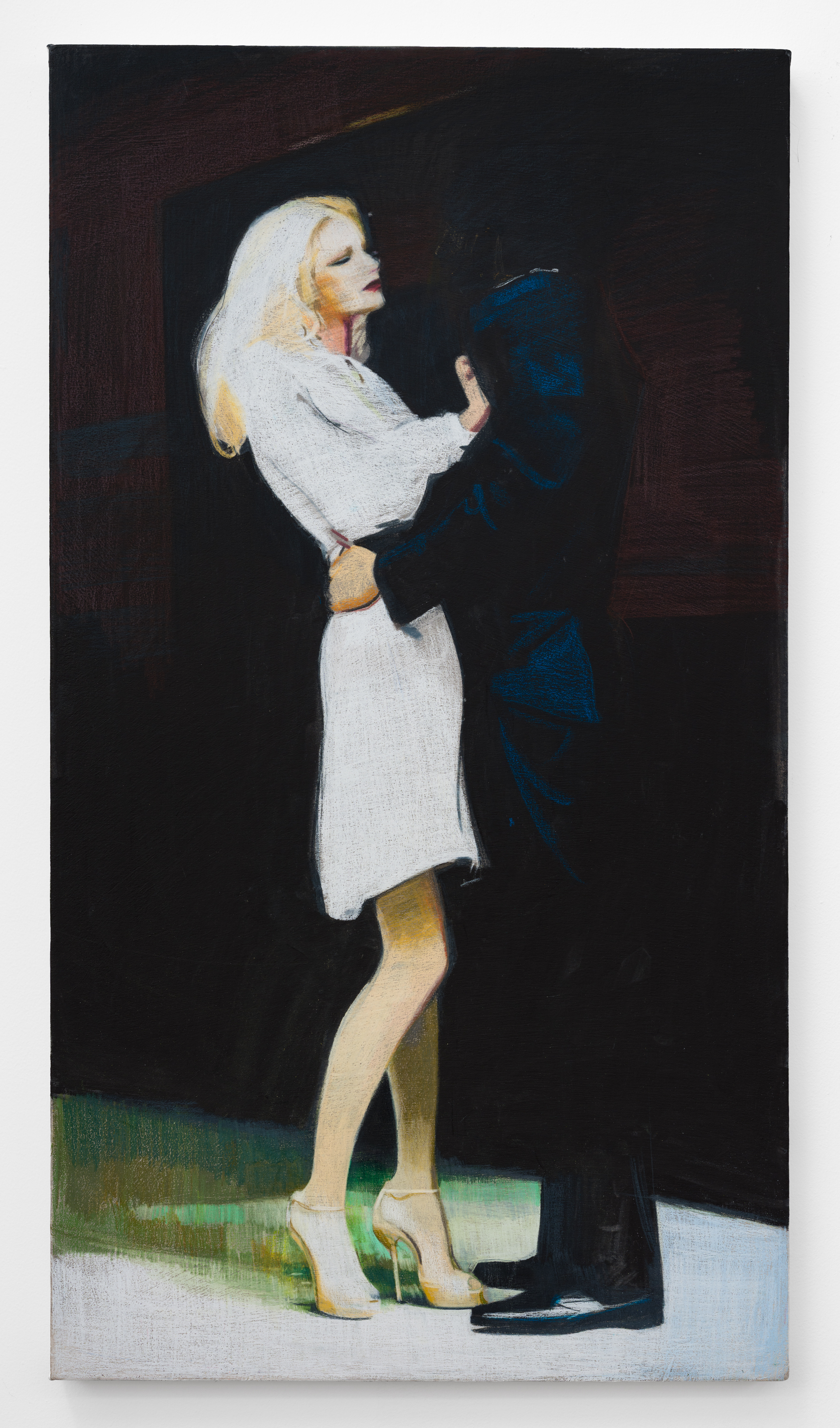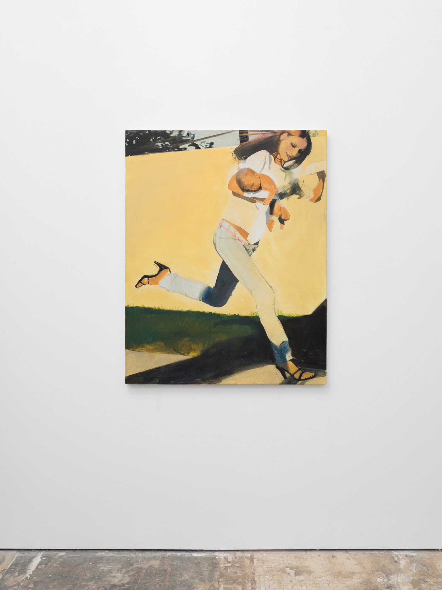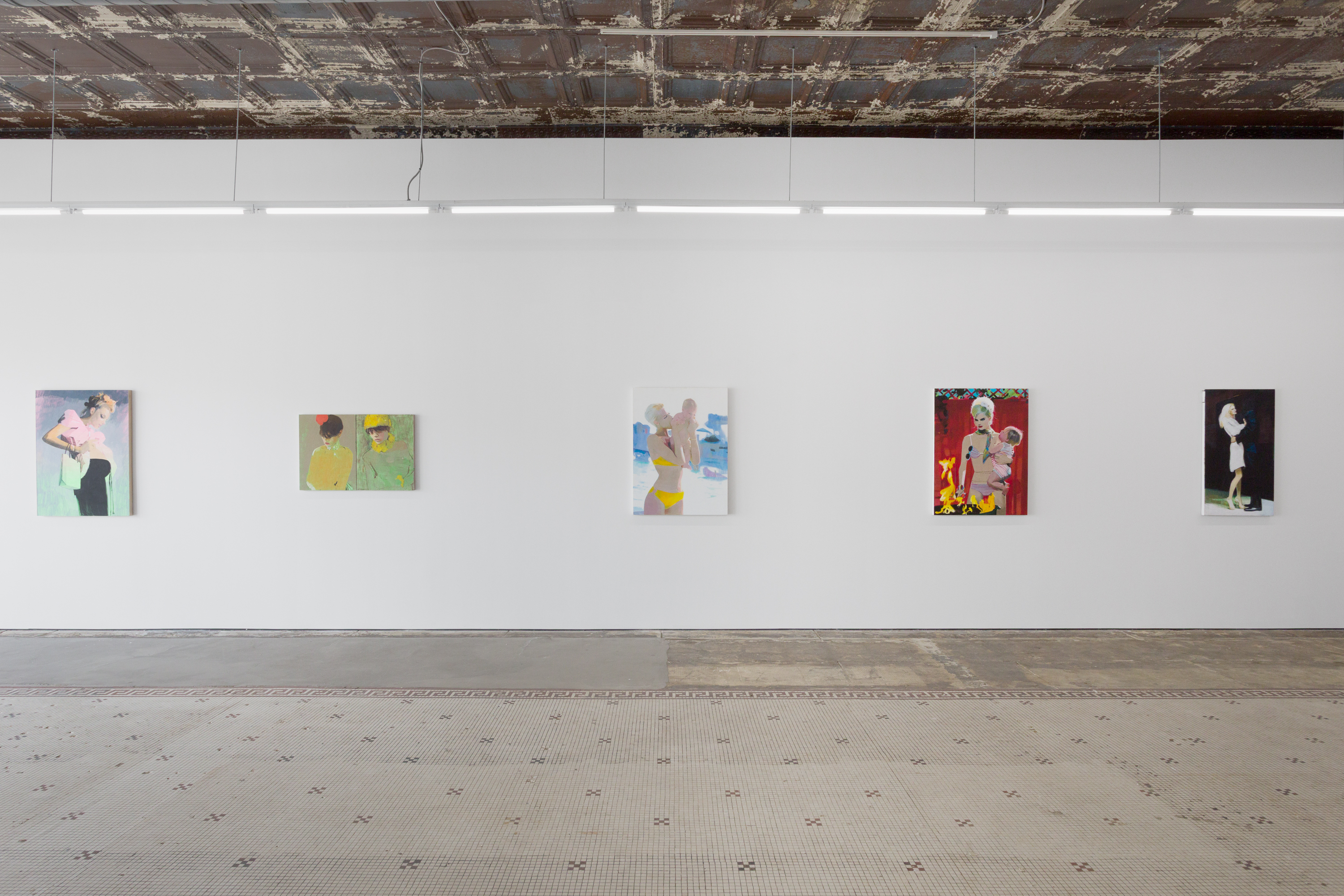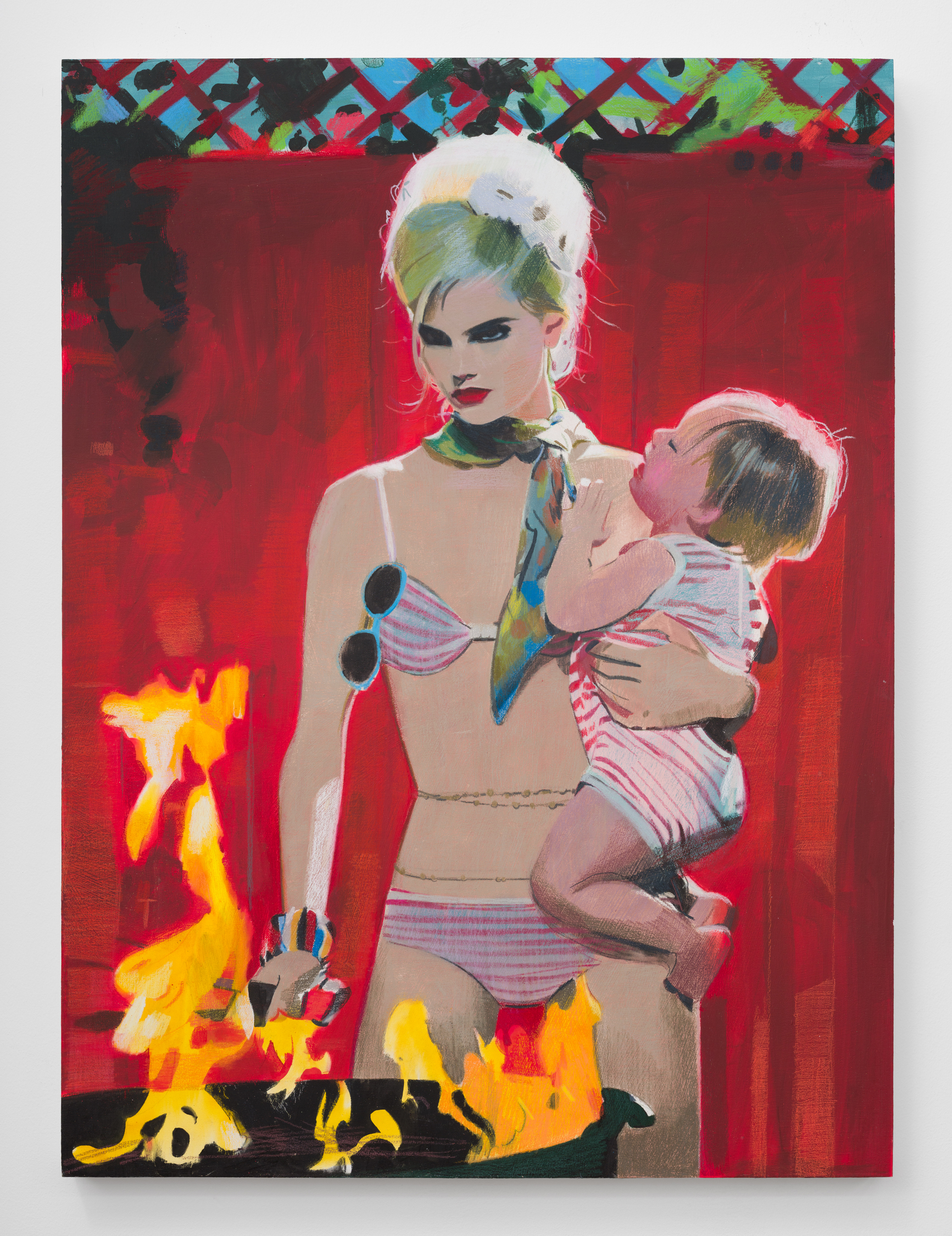 Taurins’ exhibition is a full lifecycle where such cinematic polarities abound and such ancient truths of light and dark dance in unison. Cherubic babies dangle precariously as their mothers sprint frenziedly in high heels or brood over a spitfire barbecue pit. Couples embracing appear in chiaroscuro, filmic cliches turn ambiguous by garish color and phantom bodies. A group of women prostrate themselves in apparent mourning over a cemetery lawn. Together the works here encircle the viewer in a confounding visual and narrative experience akin to the phenomenon of life review in which the sum of one’s life experiences are seen all at once in the mind’s eye; the joy present in one work belies the gravity of the next, at times even individual elements confound the dichotomous emotional whole of a single work. The artist’s interest in pre-Hays Code Hollywood films is also evident in this mix where image unbridled by doctrinal restraints yields a more ambiguous kind of tension. This is life as it is, not as we wish it to be, and the artist’s hand dazzles with that knowing thrust, her stage set for a multitude.