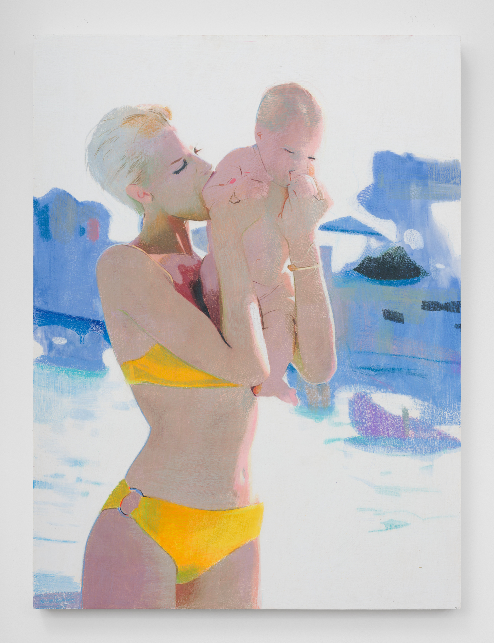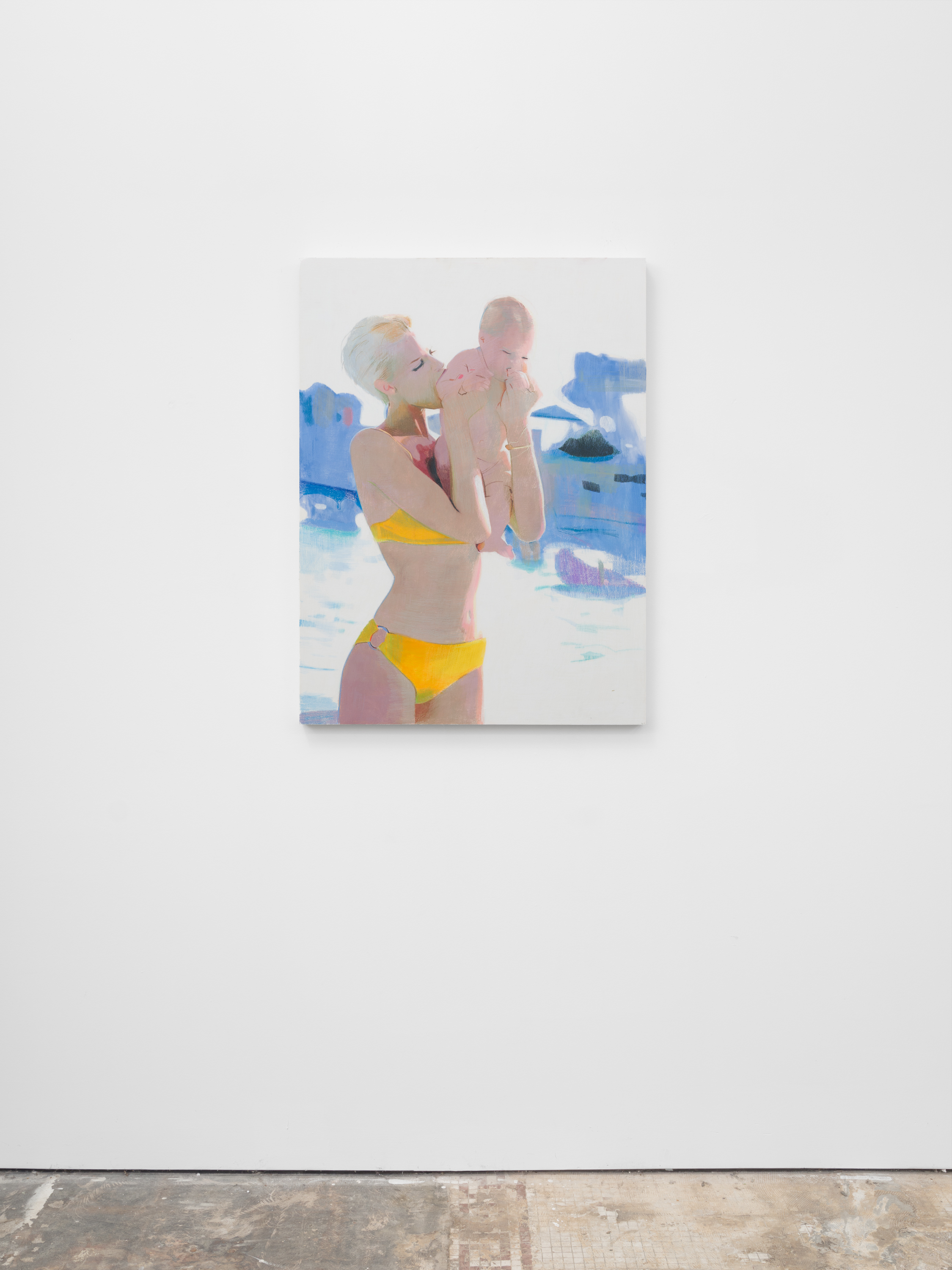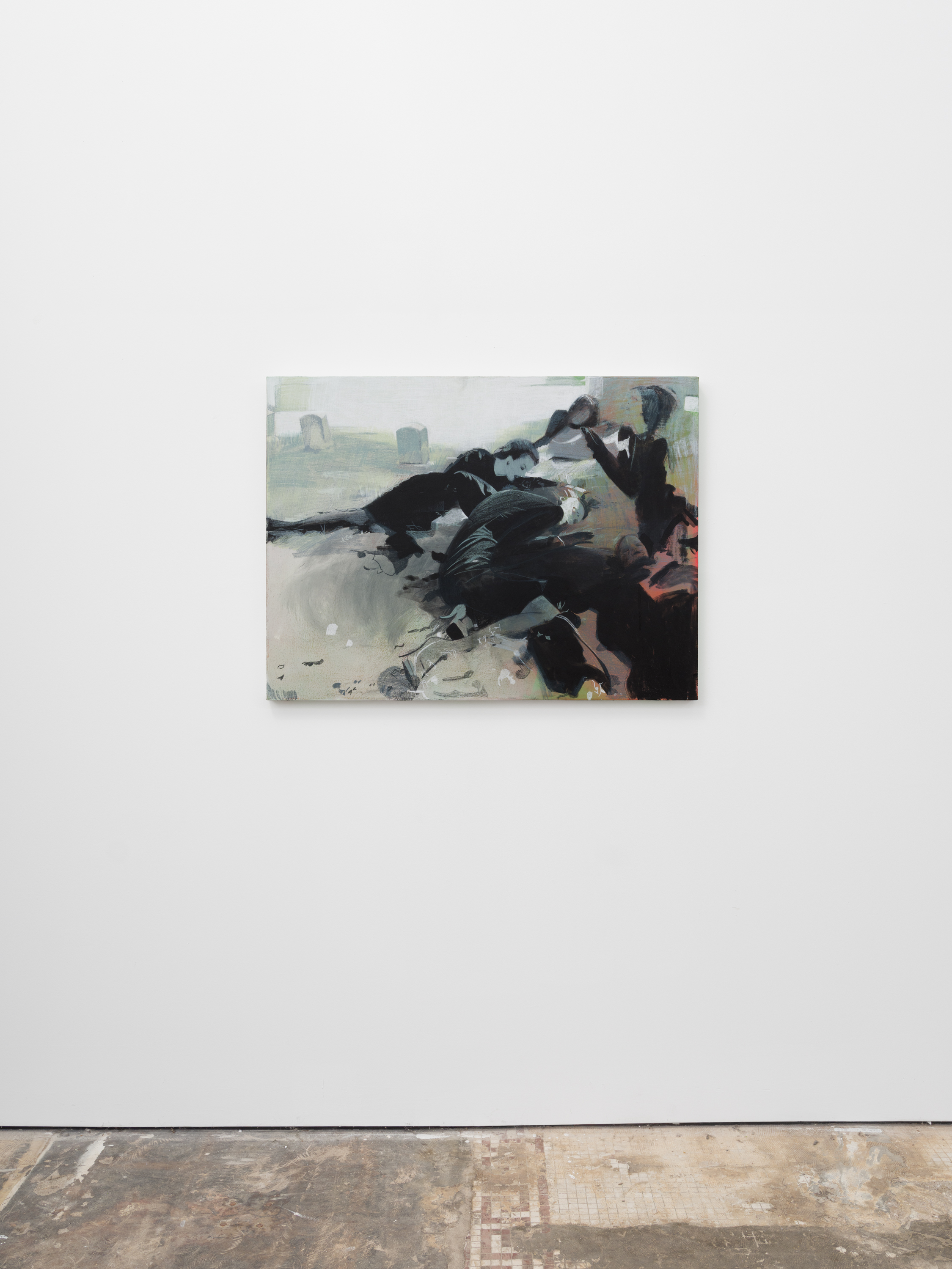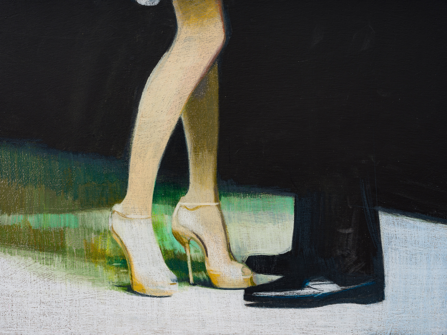 Taurins’ exhibition is a full lifecycle where such cinematic polarities abound and such ancient truths of light and dark dance in unison. Cherubic babies dangle precariously as their mothers sprint frenziedly in high heels or brood over a spitfire barbecue pit. Couples embracing appear in chiaroscuro, filmic cliches turn ambiguous by garish color and phantom bodies. A group of women prostrate themselves in apparent mourning over a cemetery lawn. Together the works here encircle the viewer in a confounding visual and narrative experience akin to the phenomenon of life review in which the sum of one’s life experiences are seen all at once in the mind’s eye; the joy present in one work belies the gravity of the next, at times even individual elements confound the dichotomous emotional whole of a single work. The artist’s interest in pre-Hays Code Hollywood films is also evident in this mix where image unbridled by doctrinal restraints yields a more ambiguous kind of tension. This is life as it is, not as we wish it to be, and the artist’s hand dazzles with that knowing thrust, her stage set for a multitude.
