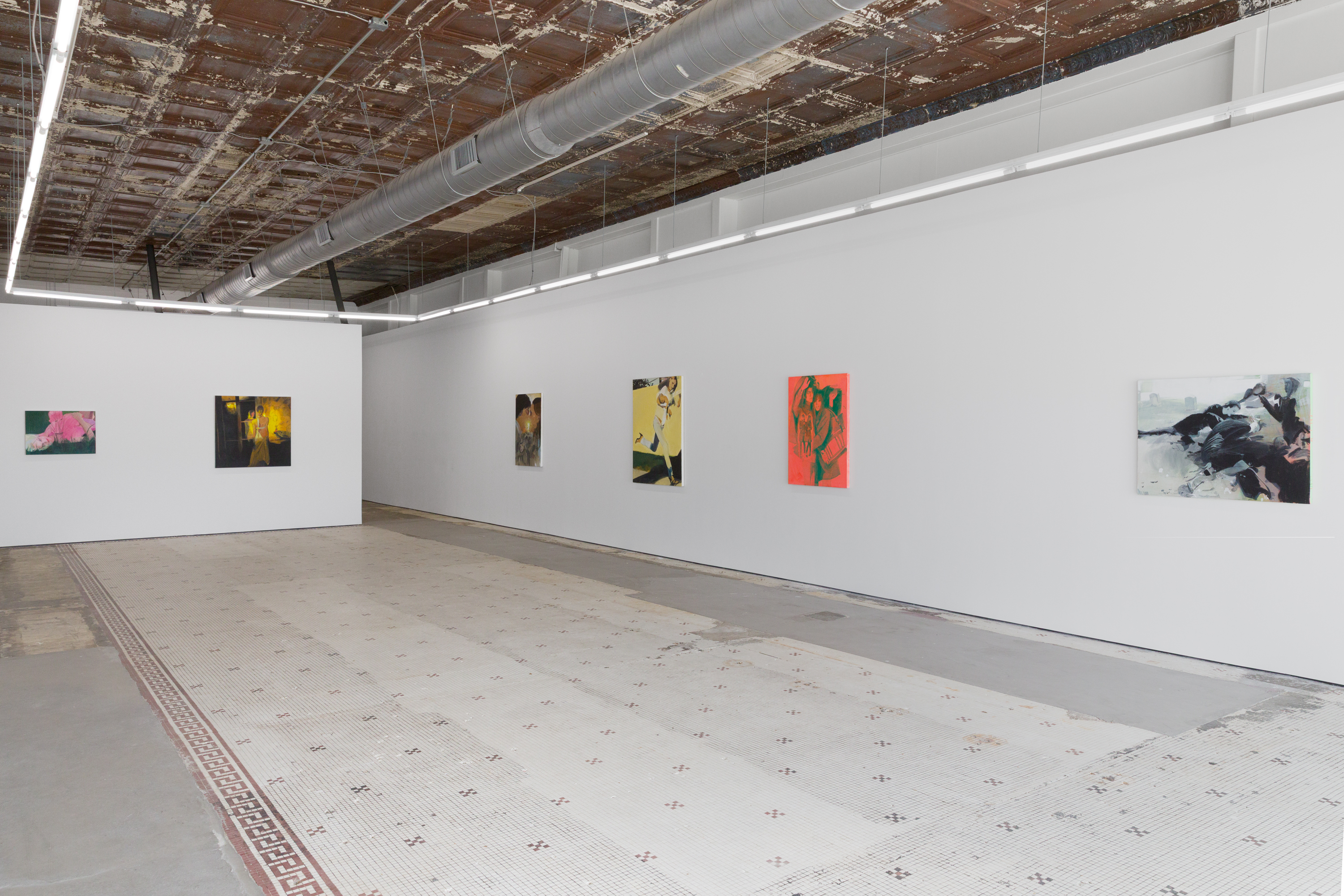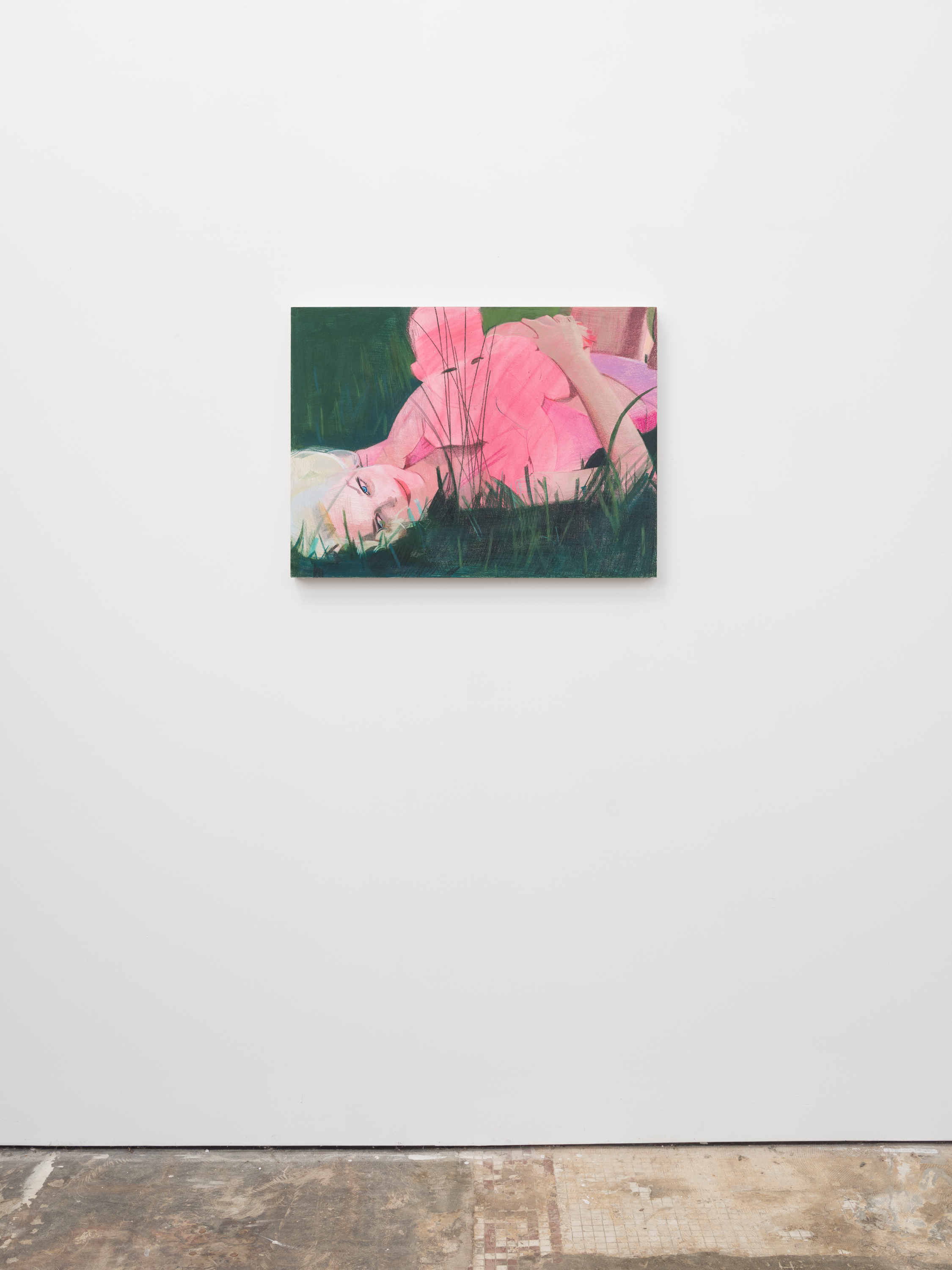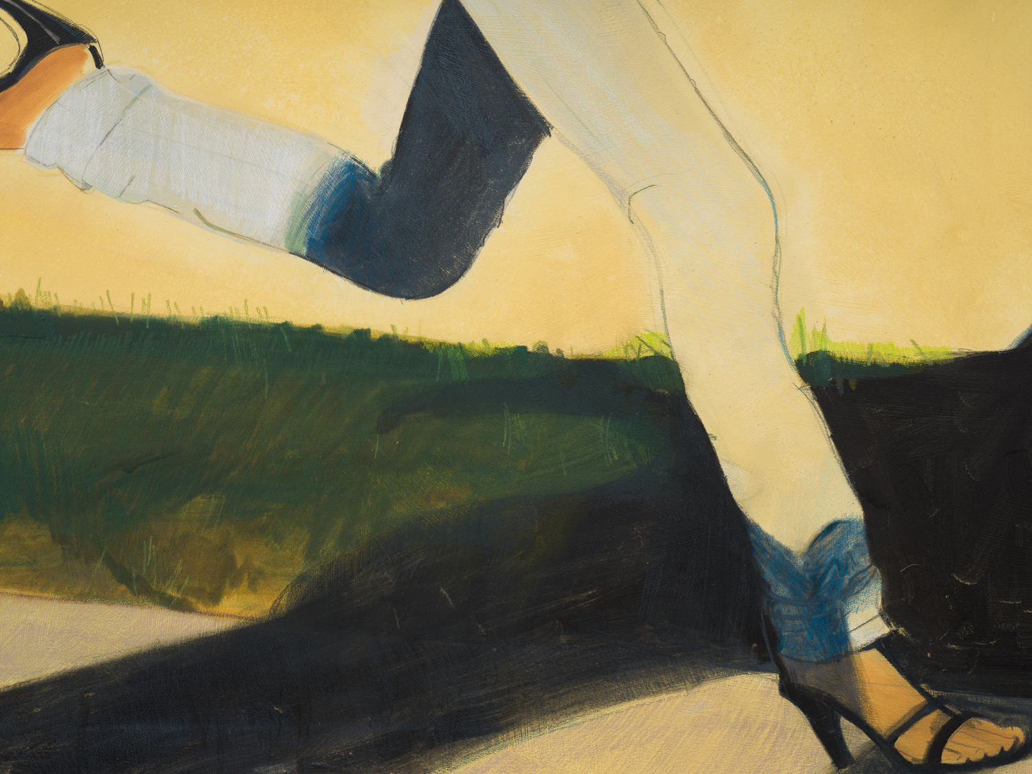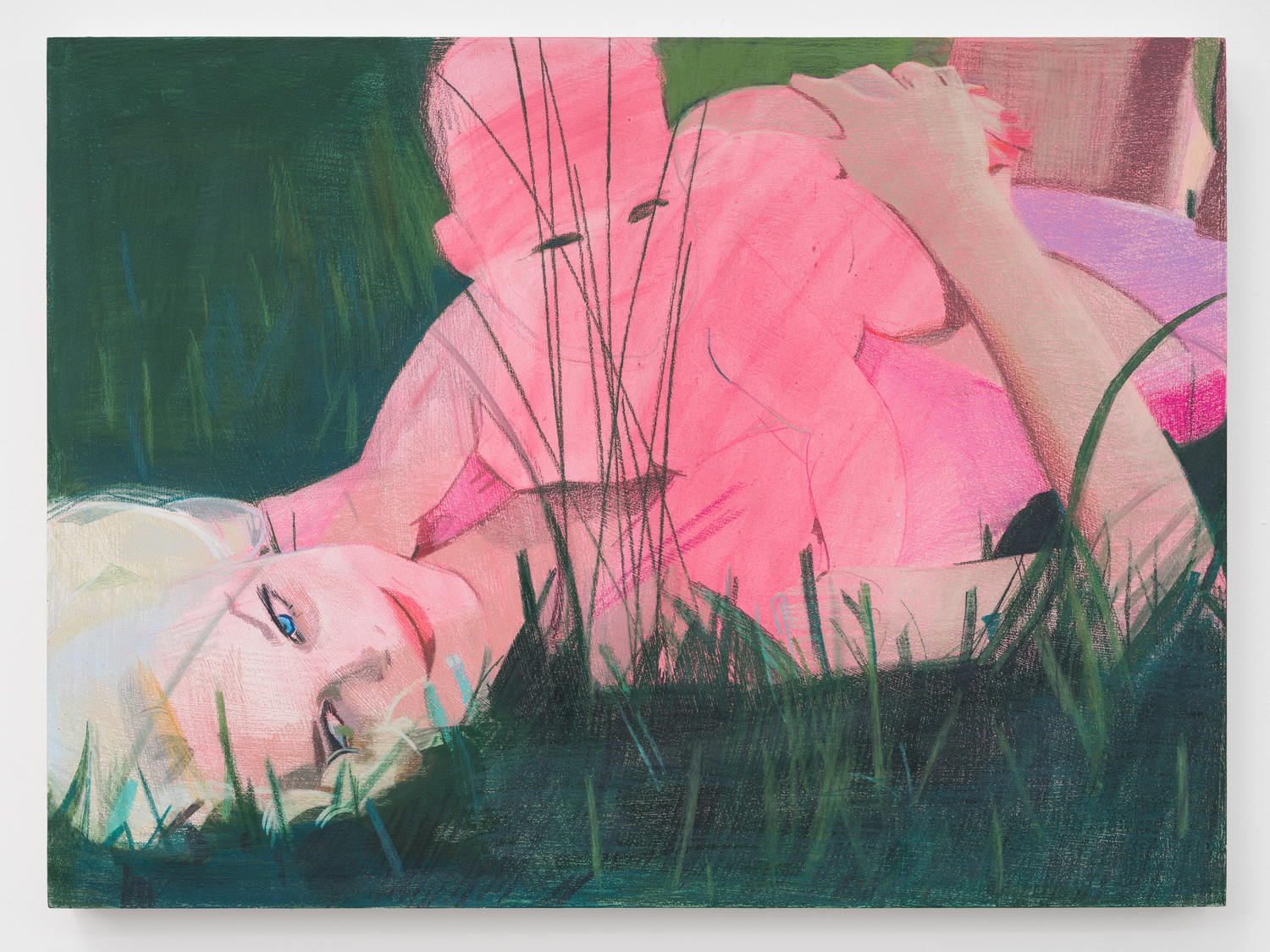 Taurins’ exhibition is a full lifecycle where such cinematic polarities abound and such ancient truths of light and dark dance in unison. Cherubic babies dangle precariously as their mothers sprint frenziedly in high heels or brood over a spitfire barbecue pit. Couples embracing appear in chiaroscuro, filmic cliches turn ambiguous by garish color and phantom bodies. A group of women prostrate themselves in apparent mourning over a cemetery lawn. Together the works here encircle the viewer in a confounding visual and narrative experience akin to the phenomenon of life review in which the sum of one’s life experiences are seen all at once in the mind’s eye; the joy present in one work belies the gravity of the next, at times even individual elements confound the dichotomous emotional whole of a single work. The artist’s interest in pre-Hays Code Hollywood films is also evident in this mix where image unbridled by doctrinal restraints yields a more ambiguous kind of tension. This is life as it is, not as we wish it to be, and the artist’s hand dazzles with that knowing thrust, her stage set for a multitude.