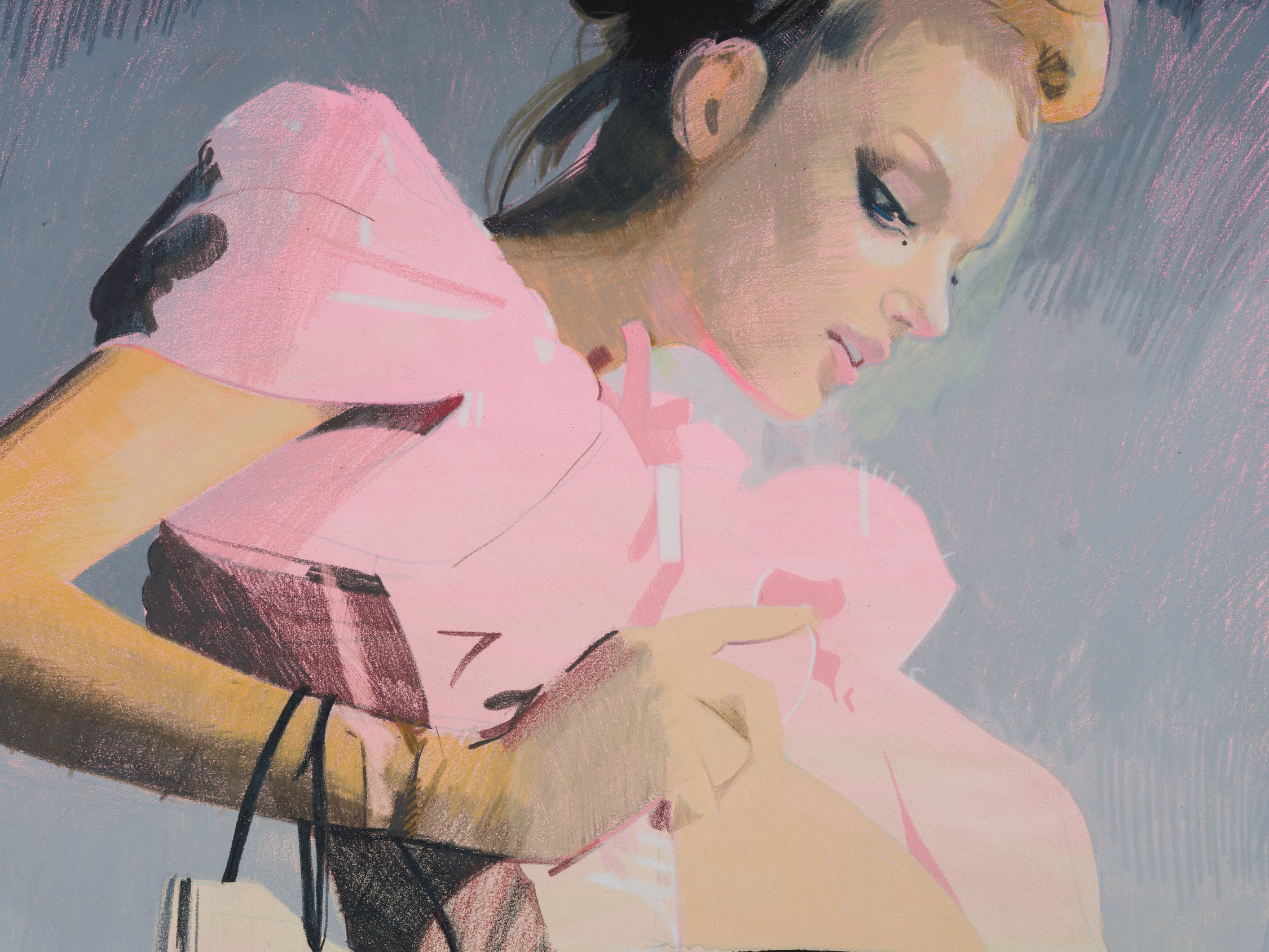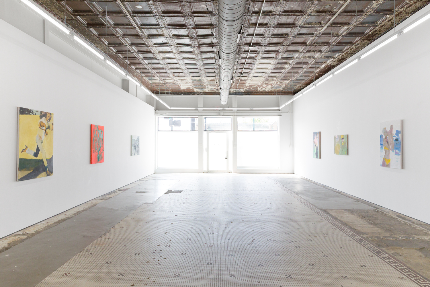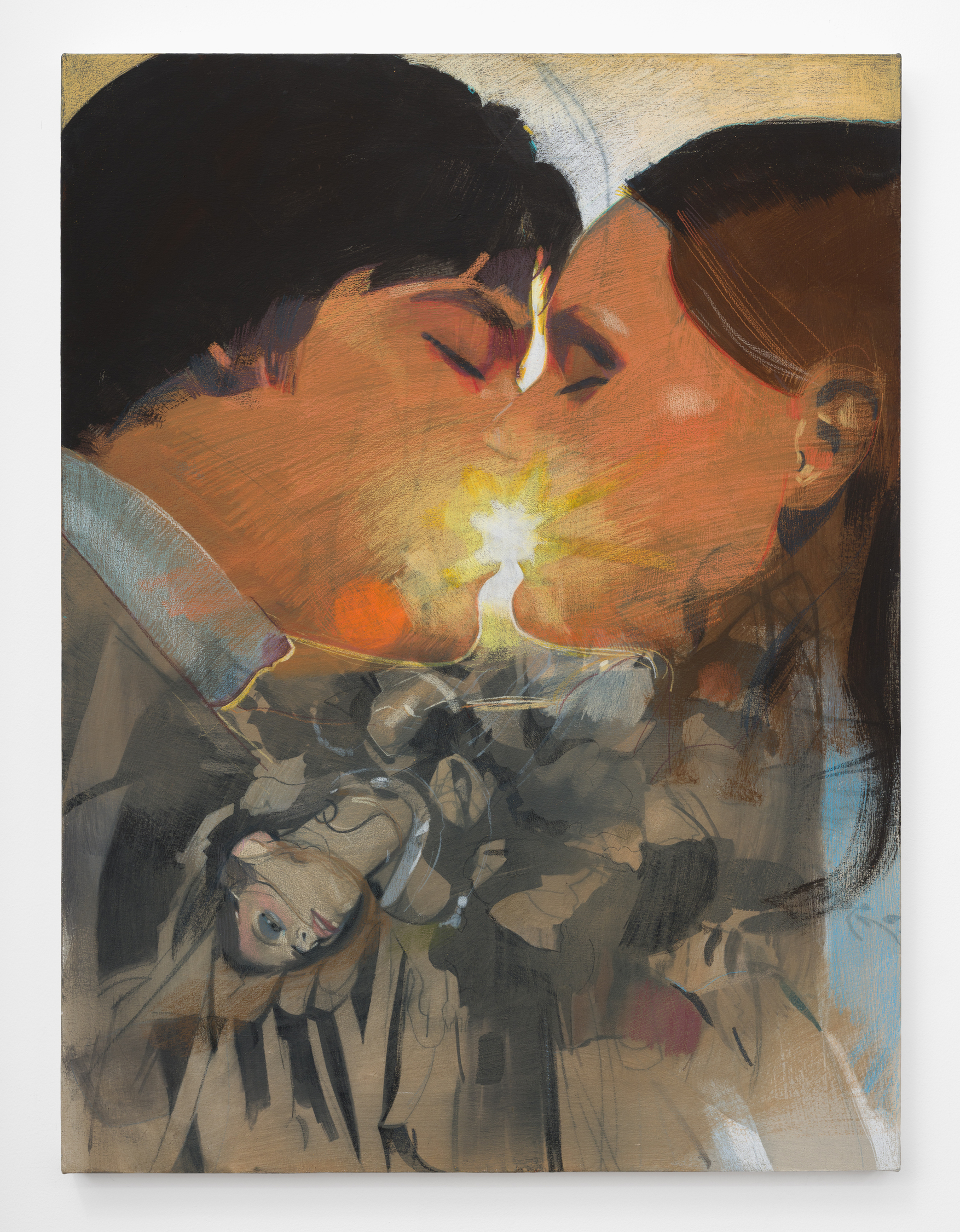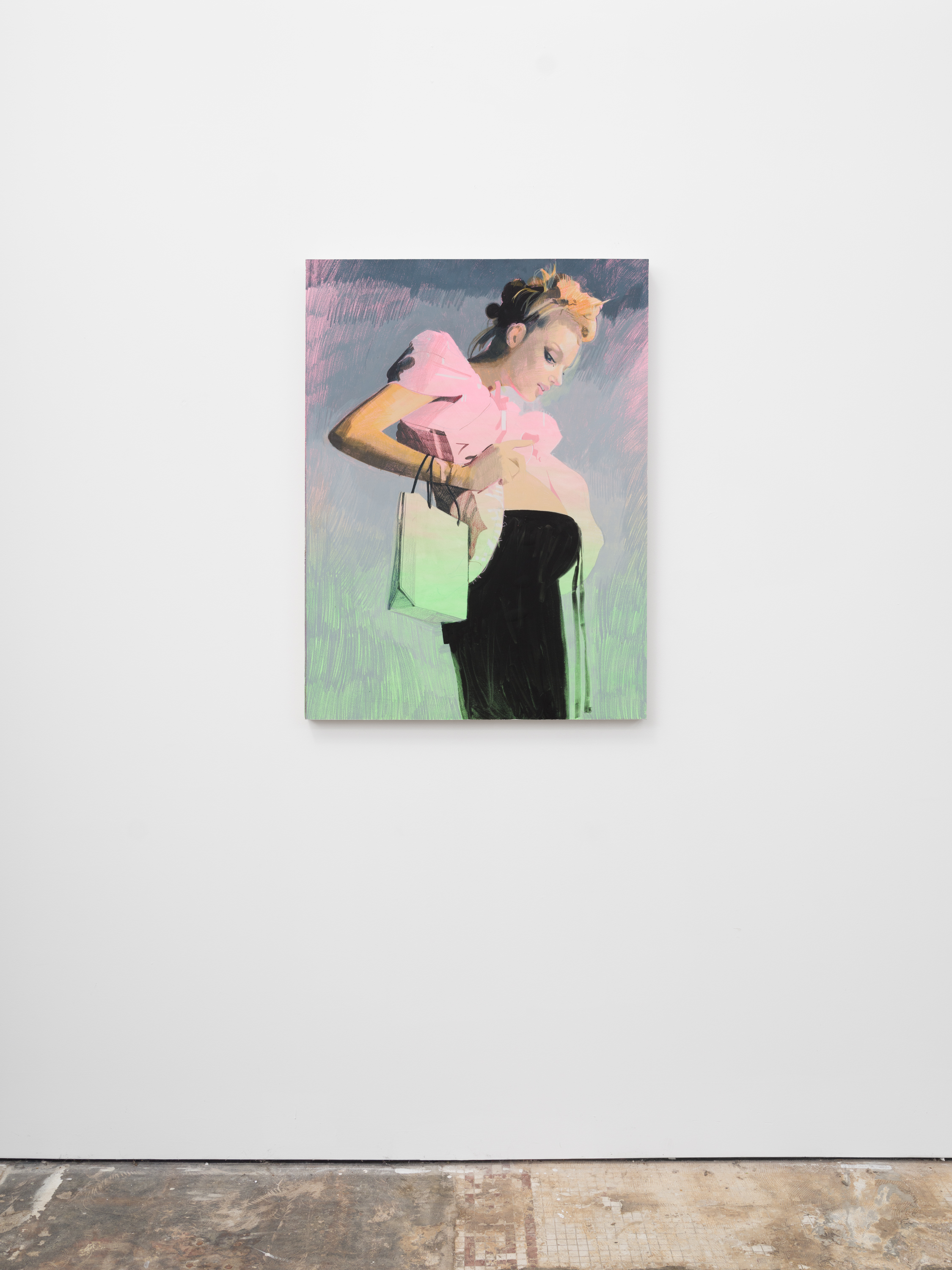 Taurins’ exhibition is a full lifecycle where such cinematic polarities abound and such ancient truths of light and dark dance in unison. Cherubic babies dangle precariously as their mothers sprint frenziedly in high heels or brood over a spitfire barbecue pit. Couples embracing appear in chiaroscuro, filmic cliches turn ambiguous by garish color and phantom bodies. A group of women prostrate themselves in apparent mourning over a cemetery lawn. Together the works here encircle the viewer in a confounding visual and narrative experience akin to the phenomenon of life review in which the sum of one’s life experiences are seen all at once in the mind’s eye; the joy present in one work belies the gravity of the next, at times even individual elements confound the dichotomous emotional whole of a single work. The artist’s interest in pre-Hays Code Hollywood films is also evident in this mix where image unbridled by doctrinal restraints yields a more ambiguous kind of tension. This is life as it is, not as we wish it to be, and the artist’s hand dazzles with that knowing thrust, her stage set for a multitude.