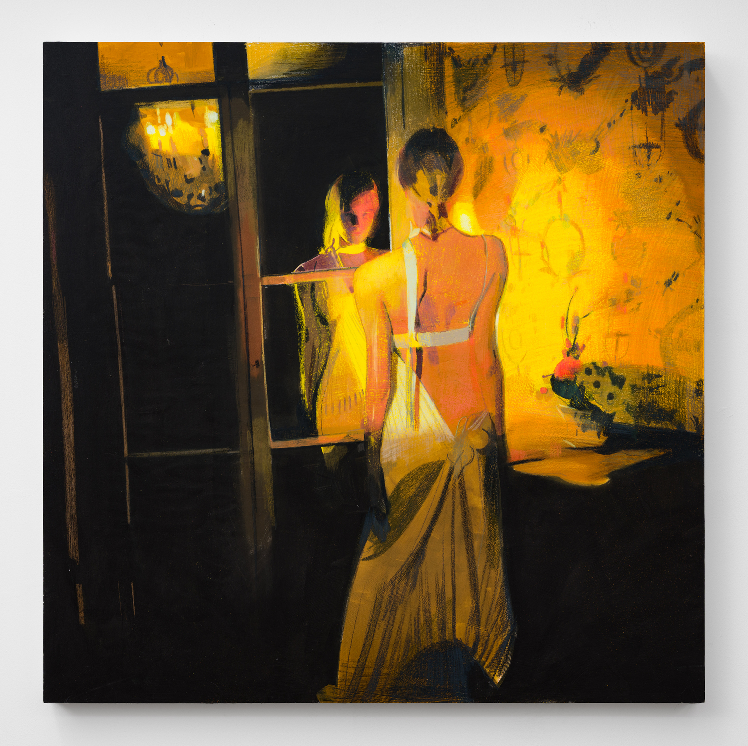 Autobiography is not entirely absent from this encompassing world—Taurins’ personal is also universal. Her interest in Taoist thought subtly emerges in the works on view, and more pronouncedly does her recent stint of baby fever. The artist’s experience considering the possibilities of pregnancy and motherhood are revealed not just in her figuration but as powerfully in its treatment. Fanny’s prank in Funny Girl resonates in darker ways through Taurins’ own woman in white, an ersatz bride confronting her reflection in the midnight glow of a domestic scape, or in the resigned smirk on the face of her sprinting mom juggling baby, diaper and powder while fleeing, or running toward, the unknown. These are the artist’s showstoppers, double entendres simultaneously proving her skill and laying bare her all-too-real fear at the thought of motherhood’s consequences for a woman in the prime of her career. “All universal things shoulder the Yin and embrace the Yang.”